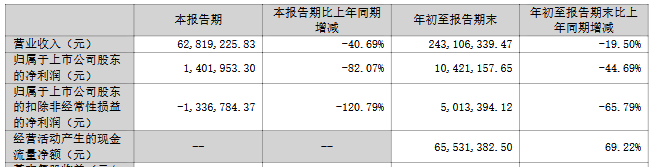 2025年1-9月,公司实现营业收入2.43亿元,同比下降19.50%;归属于上市公司股东的净利润为1,042.12万元,同比下降44.69%;归属于上市公司股东的扣除非经常性损益的净利润为501.34万元,同比下降65.79%;经营活动产生的现金流量净额为6,553.14万元,同比增长69.22%。