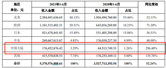 值得关注的是,2021年上半年,公司积极投入中国大陆市场,境内实现主营业务收入1.77亿元,同比增长296.40%。