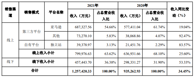 事实上,在国内市场表现亮眼外,这个从亚马逊出发的品牌也成功开拓了更多第三方线上销售渠道。其除亚马逊平台的第三方平台营收增长了92.47%,在财报中也提及,还有包括速卖通、ebay,以及天猫、京东等平台渠道。此外,独立站营收占比也进一步扩大,提高到了3.13%,独立站总营收提高83.57%。多线上渠道运营下,安克创新在亚马逊上的营收占总营收比也下降了7%。
