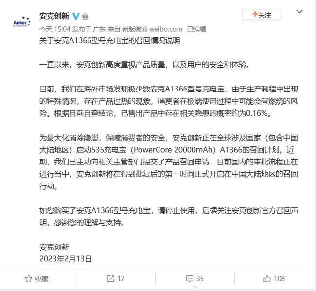 安克表示,如您购买了安克 A1366 型号充电宝,请停止使用,后续关注安克创新官方召回声明,感谢您的理解与支持。