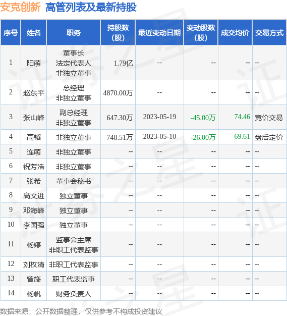 安克创新的高管列表及最新持股情况如下: