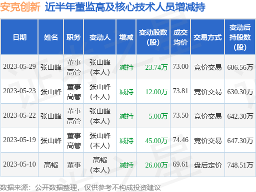 根据5月30日市场公开信息、上市公司公告及交易所披露数据整理,安克创新(300866)最新董监高及相关人员股份变动情况:2023年5月29日公司董事,高管张山峰共减持公司股份23.74万股,占公司总股本为0.0584%。变动期间公司股价上涨3.71%,5月29日当日收盘报73.01元。