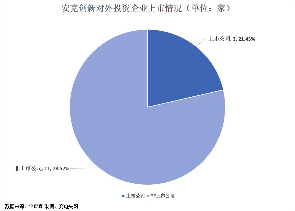 安克创新对外投资的企业中,上市公司 3 家,分别为上海南芯半导体科技股份有限公司、纳微半导体科技股份有限公司、致欧家居科技股份有限公司,占比 21.43%;非上市公司 11 家,占比 78.57%。