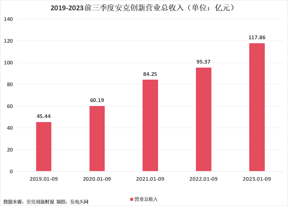2019-2023年前三季度安克创新分别实现营业总收入45.44亿元、60.19亿元、84.25亿元、95.37亿元、117.86亿元,其中2020、2021、2022、2023前三季度同比变动分别为32.45%、39.99%、13.19%、23.59%。