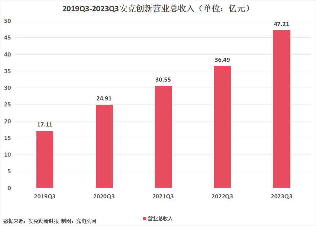 2019-2023年第三季度单季度安克创新分别实现营业总收入17.11亿元、24.91亿元、30.55亿元、36.49亿元、47.21亿元,2020Q3、2021Q3、2022Q3、2023Q3同比变动分别为45.57%、22.63%、19.46%、29.37%。