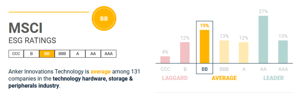 尽管面临诸多挑战,安克的业绩表现依然亮眼。2024年上半年,公司营收达到96.5亿元,同比上升36.55%。其中,充电储能产品贡献最大,占比51.56%,智能创新产品占比24.46%,智能影音类产品占比23.93%。安克还获得了MSCI中国A股在岸指数的纳入,并在ESG评级方面取得了一定进展。然而,根据MSCI官网显示的评级与等级分布,安克创新仍落在后35%表现的区间内,这意味着公司在ESG表现上还有较大的提升空间。