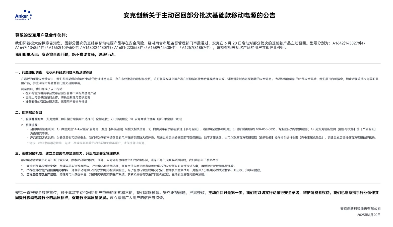 “请持有相关批次产品的用户立即停止使用。”6月20日,安克创新(300866.SZ)官网发布召回公告,因电芯品质问题可能引发过热甚至燃烧的安全隐患,七款型号合计超过71万件的移动电源被紧急召回。而四天前,罗马仕刚刚宣布召回超49万台存在自燃风险的移动电源产品。