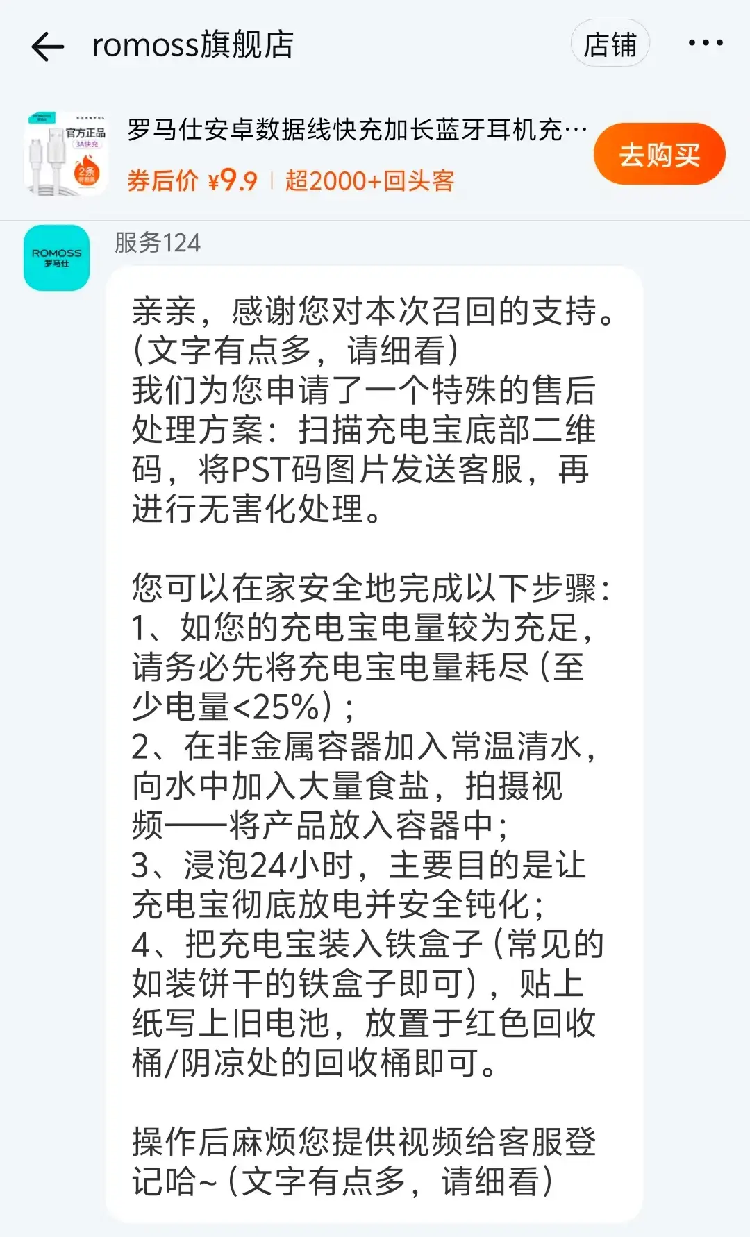 对此,搜狐财经致电罗马仕客户服务热线,但始终无人工接听,安克官方热线也提示占线中。搜狐财经又分别咨询罗马仕和安克的天猫旗舰店客服,罗马仕客服称可以自行在家进行无害化处理,提供视频给客服登记即可,但自行操作后如何申请退款?几个工作日内到账?均再无说明。