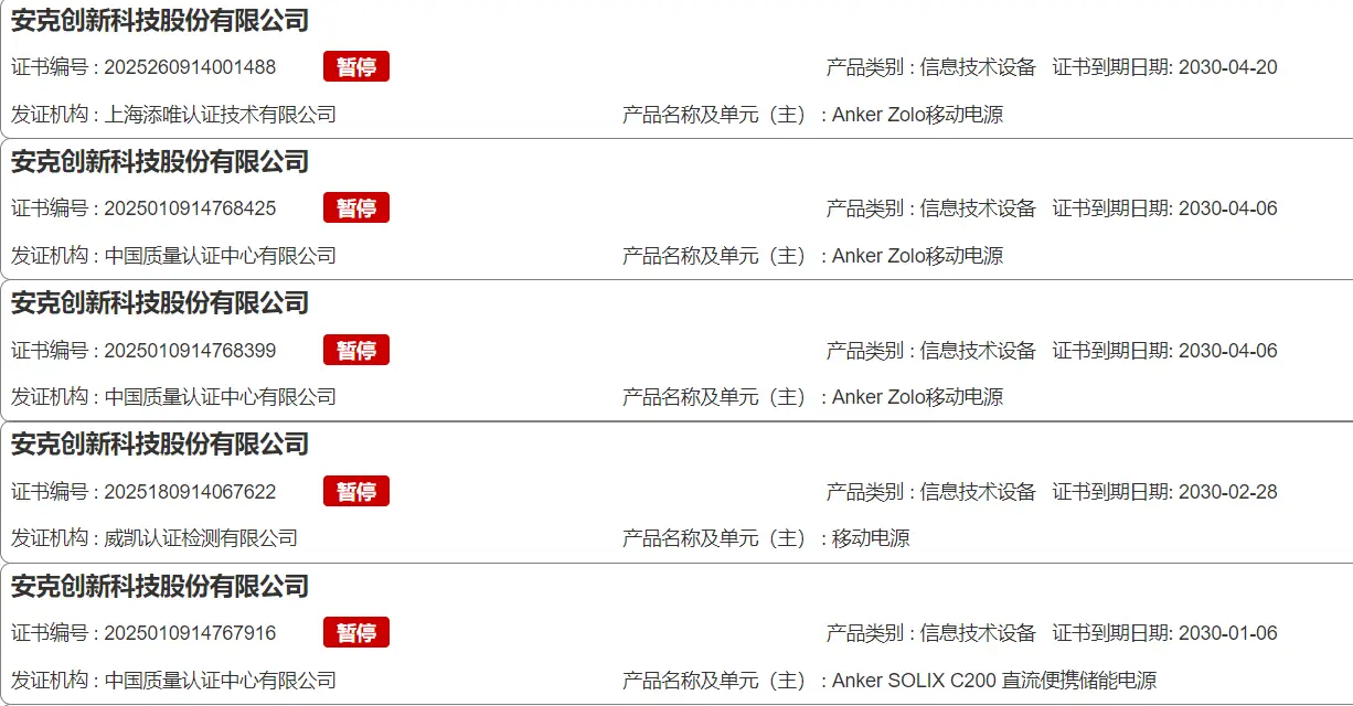 全国认证认可信息公共服务平台显示,自6月以来,安克创新多款移动电源产品的3C认证证书显示“暂停”,另有部分移动电源产品证书状态显示为“撤销”,罗马仕多款快充移动电源产品3C认证证书显示“注销”,另外,倍思科技、绿联科技等品牌也都有移动电源的3C证书于近日“暂停”。