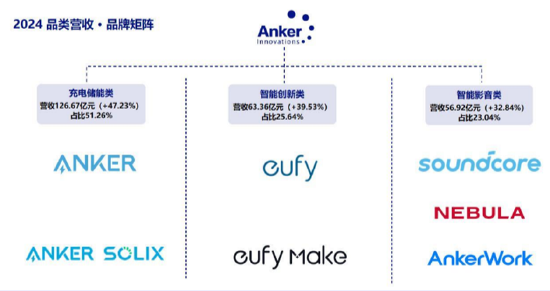 安克创新聚焦智能用电、智能家居自动化、智能影音等三大产业方向,现已形成数码充电、消费级储能、智能清洁、智能安防、智能音频、智能投影等核心业务聚焦智能用电、智能家居自动化、智能影音等三大矩阵。2024年,充电储能类产品创收126.67亿元,占比51.26%;智能创新类产品创收63.36亿元,占比25.64%;智能影音类创收56.92亿元,占比23.04%。