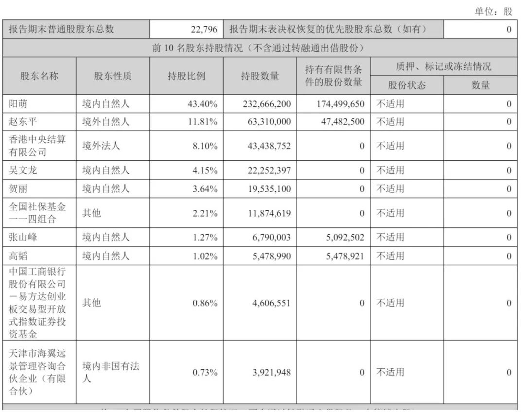 截至2025年6月30日,阳萌持股为43.77%,赵东平持股为11.91%,香港中央结算有限公司持股为8.91%,吴文龙持股为4.19%,贺丽持股为3.68%,全国社保基金一一四组合持股为2.1%;
