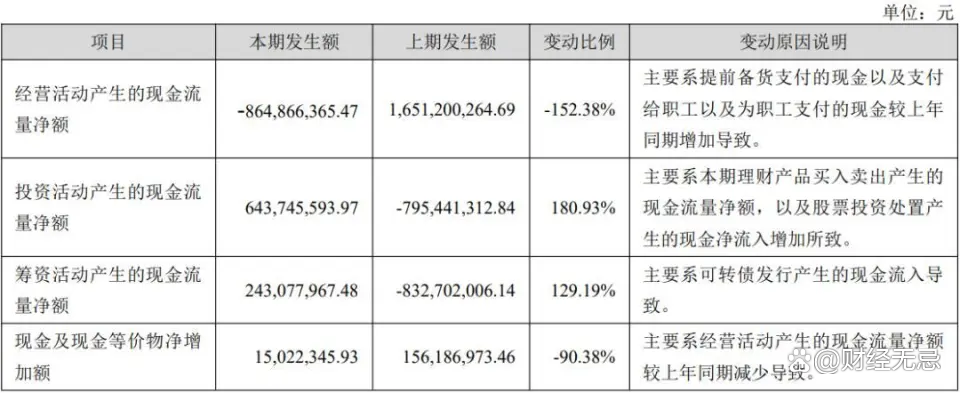 而存货规模的大幅攀升,不仅占用了大量流动资金,还使得公司经营活动现金流量净额由2024年同期的净流入8.41亿元转为净流出11.32亿元,资金周转压力显著加大,流动性风险上升。