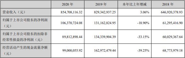 杰美特2020年年度报告显示,2020年,公司实现营业收入8.55亿元,同比增长3.06%;实现归属于上市公司股东的净利润1.06亿元,同比减少18.90%;实现归属于上市公司股东的扣除非经常性损益的净利润8981.29亿元,同比减少33.15%%;经营活动产生的现金流量净额为9900.01亿元,同比减少39.25%。