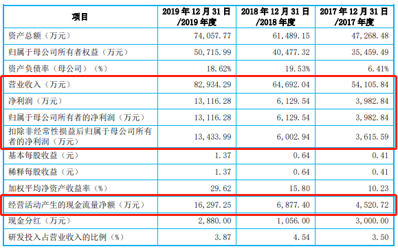 上市前,杰美特业绩逐年上涨。据招股说明书,2017年至2019年,公司实现营业收入分别为5.41亿元、6.47亿元、8.29亿元,实现归属于母公司所有者的净利润3982.84万元、6129.54万元、1.31亿元,实现扣除非经常性损益后归属于母公司所有者的净利润3615.59万元、6002.94万元、1.34亿元,经营活动产生的现金流量净额分别为4520.72万元、6877.40万元、1.63亿元。
