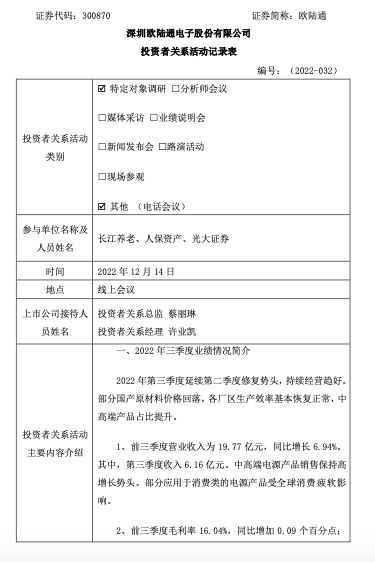 深圳欧陆通电子股份有限公司(以下简称“欧陆通”或“公司”)12月15日发布公告称,公司于12月14日接受了长江养老、人保资产、光大证券的特定对象调研。在调研中,欧陆通称,2022年第三季度延续第二季度修复势头,持续经营趋好。部分国产原材料价格回落,各厂区生产效率基本恢复正常,中高端产品占比提升。