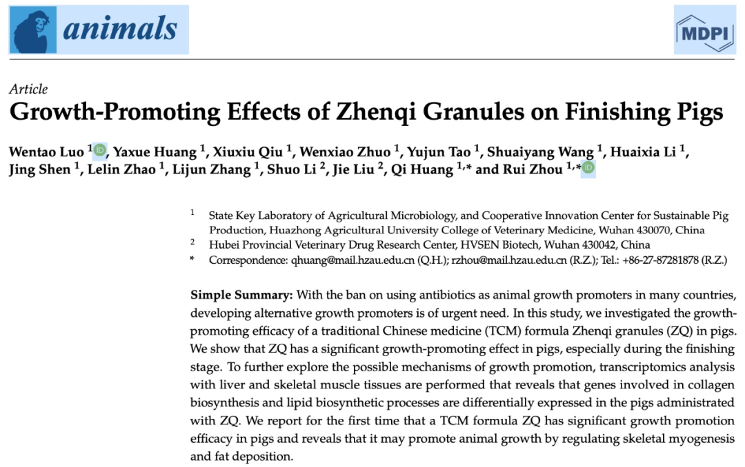 回盛生物研发的贞芪颗粒,由华中农大-回盛研究院周锐教授团队经科学验证(已在国际学术期刊《Animals》发表,详见下图)——科学组方,益气固本,健脾胃、滋补肝肾,可用于增强猪免疫力、促生长。
