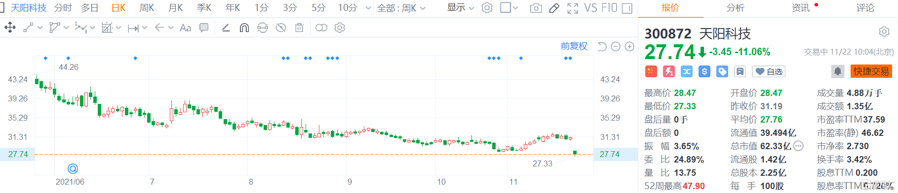 交易行情显示,天阳科技11月22日低开8.72%,开盘价为28.47元/股,开盘后股价继续走低,截至北京商报记者发稿,报28.25元/股,跌幅为9.43%,盘中最低价格为27.33元/股,为天阳科技历史新低。