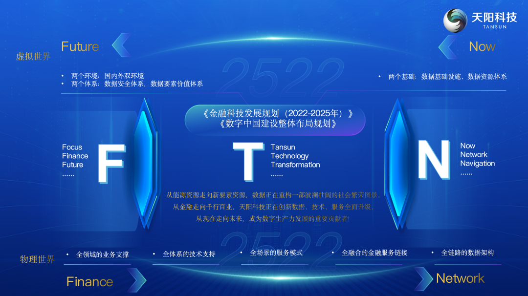 T+F+N数据战略,就是“新天阳”的一部。站在“技术+市场”的双维角度,其可解构为“2522”框架。换为业务战略角度,T+F+N数据战略又处于“新天阳”的枢纽位置——其可自下而上地支撑“底座+应用”重构,也可由内而外地提供穿透式金融场景服务。