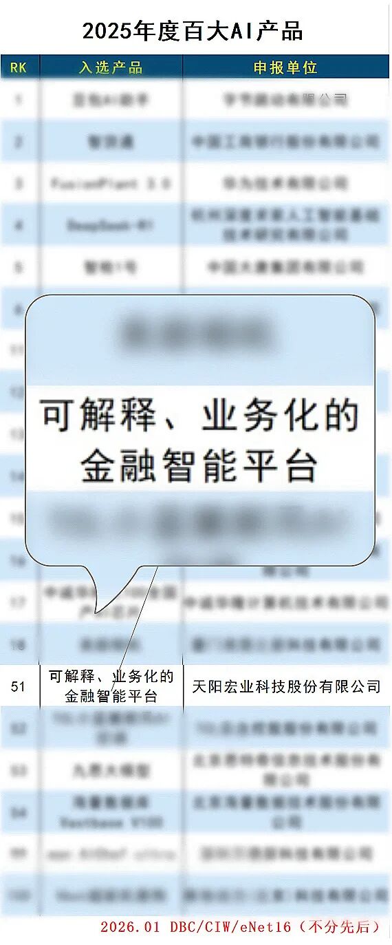 近日,由中国科学院《互联网周刊》联合德本咨询、eNet研究院联合评选的“2025年度百大AI产品”榜单正式发布。榜单汇聚了众多AI领域的产业创新成果,天阳科技“可解释、业务化的金融智能平台”成功入选。