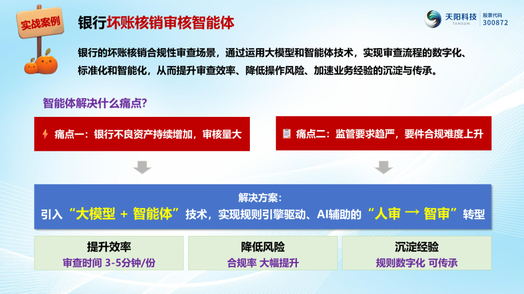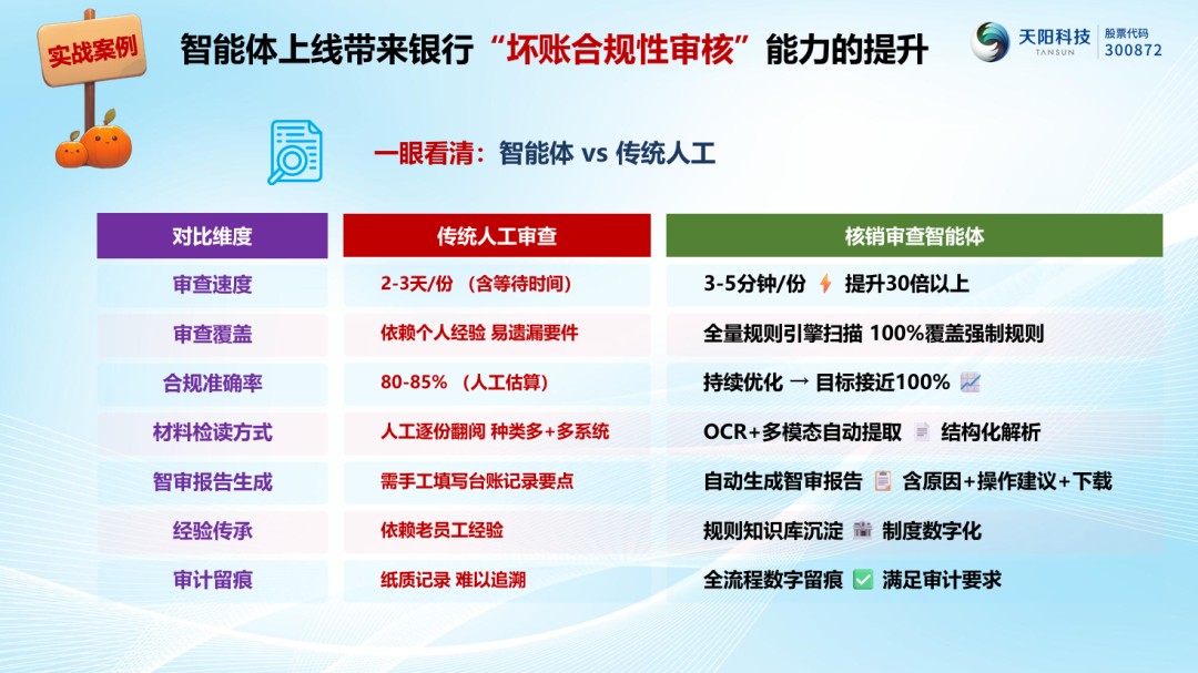 坏账核销审查智能体可大幅提升坏账业务合规性审查的效率,从审查速度、审查覆盖面、合规准确性等七个维度,大幅提升传统人工审查的效能,赋能信贷业务的最后一个环节,在金融化险的大背景之下,未来将有更大的拓展空间。