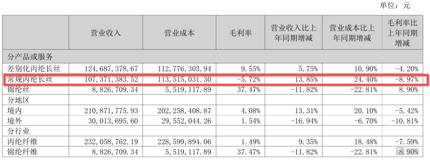 从主营业务产品的表现来看,不同产品线之间存在明显分化。上半年差别化丙纶长丝实现收入1.25亿元,毛利率为9.55%,成为公司目前唯一仍保持盈利的产品线;而常规丙纶长丝虽然实现收入1.07亿元,但毛利率却为-5.72%,显示该业务已经陷入“越卖越亏”的困境。
