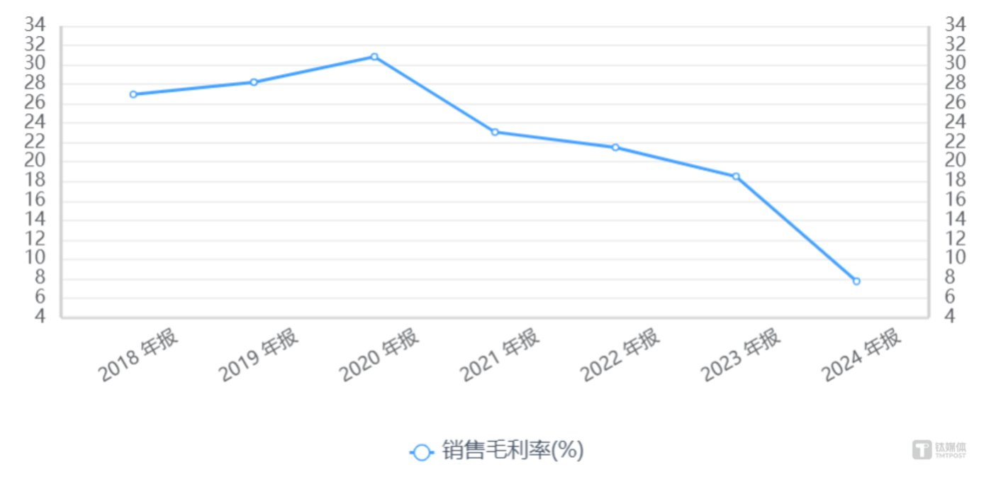 2025年上半年的财务报告显示,公司实现营业总收入2.44亿元,同比增长8.91%,从表面上看仍然维持着规模扩张的态势。但归母净利润却同比暴跌94.56%,亏损扩大至3379.95万元。更令人担忧的是,公司的毛利率从2020年的30.83%大幅萎缩至3.91%,几乎已经触及成本边缘。