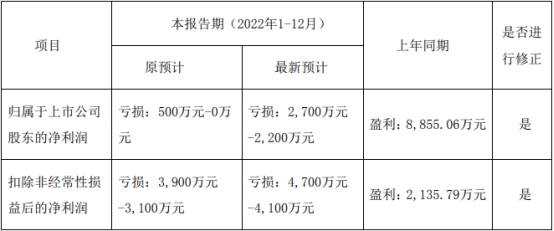 此前,公司于2023年1月31日披露的《2022年度业绩预告》中预计2022年度归属于上市公司股东的净利润区间为亏损500万元至0万元;预计扣除非经常性损益后的净利润为亏损3,900万元至3,100万元。