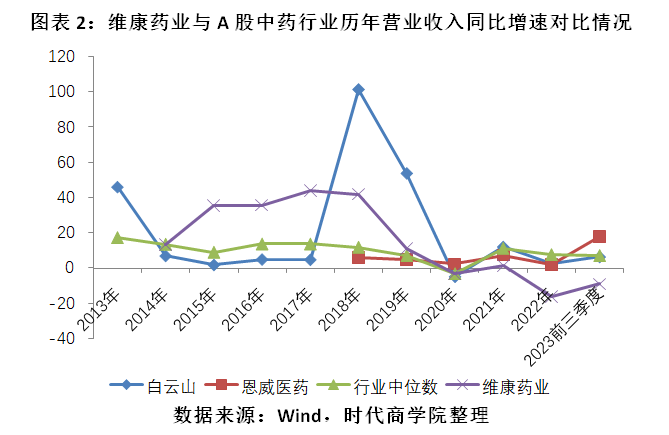 受宏观环境的积极影响,近年来中药行业的营收规模稳步增长,但维康药业的营业收入却波动起伏。