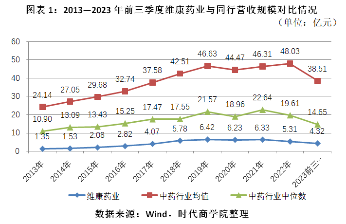对比之下,2013—2023年前三季度,维康药业的营业收入规模约为行业均值的1/10。剔除行业中基数较大的企业影响因素导致均值较大,2013—2023年前三季度,中药企业的营业收入中位数亦远高于维康药业各期营业收入。