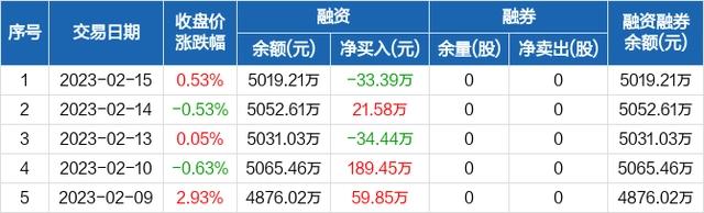 融资方面,当日融资买入170.85万元,融资偿还204.24万元,融资净偿还33.39万元。融券方面,融券卖出0股,融券偿还0股,融券余量0股,融券余额0元。融资融券余额合计5019.21万元。