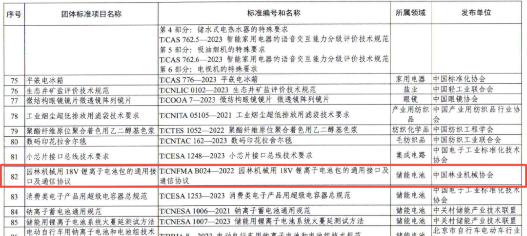 近日,工业和信息化部发布2024年团体标准应用推广典型案例名单,由中国林业机械协会组织制定、宁波大叶园林设备股份有限公司主导研制的《园林机械用18V锂离子电池包的通用接口及通信协议》(T/CNFMA B024-2022)成功入选!这一荣誉不仅是对大叶股份技术实力的高度认可,更是行业规范化发展的助力,也为大叶长期创新生态构建和可持续发展注入动能。