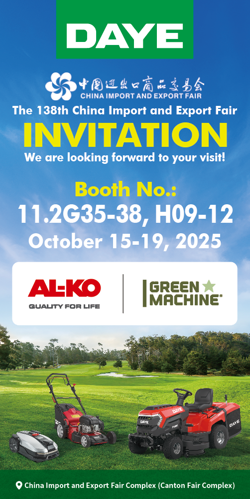 欢迎10月15-19日莅临大叶股份展位(广交会展馆11.2 G35-38, H09-12),现场体验智能割草机、骑乘式割草机及手推式割草机产品,我们的海内外销售团队也将与您面对面交流,探讨合作机遇。