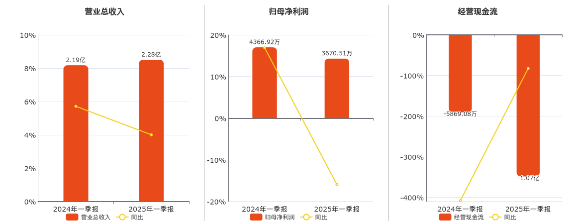 公司营业总收入为2.28亿元。归母净利润为3670.51万元,较去年同报告期归母净利润减少696.41万元,同比较去年同期下降15.95%。经营活动现金净流入为-1.07亿元,较去年同报告期经营活动现金净流入减少4857.27万元。