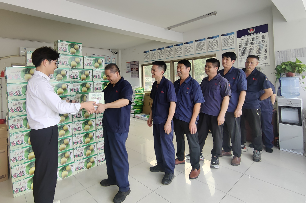 为做好职工防暑降温工作,切实维护广大职工的劳动安全和健康权益,龙利得公司党支部、工会长期开展“夏日送清凉”活动,为生产车间职工精心准备了300余份防暑降温用品,每人1箱蜜梨、2盒风油精、2盒清凉油、2条纯棉毛巾、1顶网帽。发放现场,政务人事中心工作人员将每一份清凉礼包送到职工手中,并叮嘱大家在工作中有任何不适都应及时反馈、注意休息,同时也要适当补水防暑。