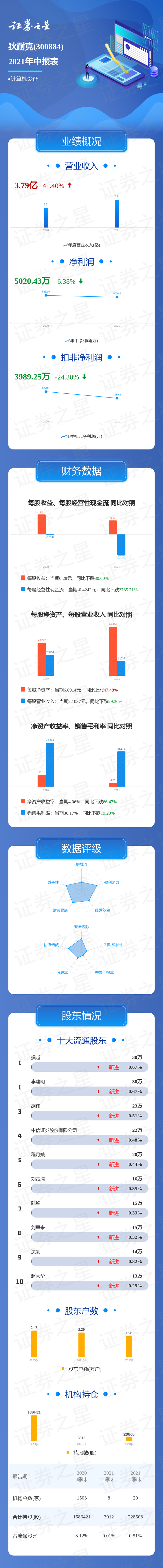 狄耐克2021中报显示,公司主营收入3.79亿元,同比上升41.4%;归母净利润5020.43万元,同比下降6.38%;扣非净利润3989.25万元,同比下降24.3%;负债率25.02%,投资收益788.0万元,财务费用-43.17万元,毛利率36.17%。