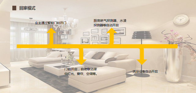智能场景系统:狄耐克智能场景模式可通过联动和控制来实现。其中通过数字智能终端、智能场景面板、手机App等方式一键开启“离家模式”、“回家模式”等场景模式,当某个场景模式开启时,自动打开或关闭时相应设定的设备;当业主通过智能门锁开启入户门时,门锁开启的瞬间联动“回家模式”,自动开启家中灯光、窗帘、空调等设备。