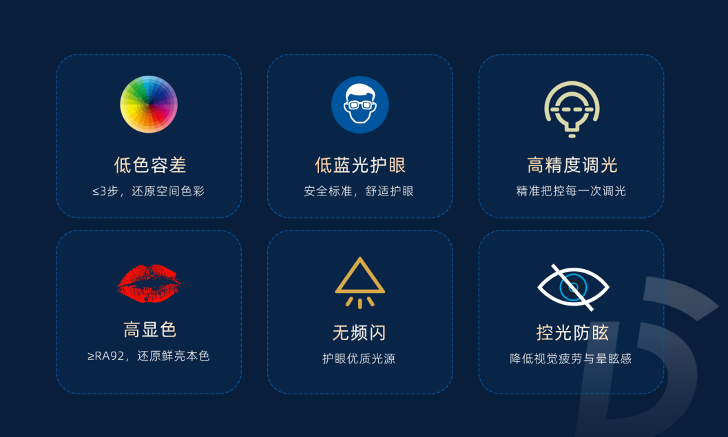 狄耐克认为用户需要健康舒适的光照明,因此狄耐克智能照明产品实现了高显色、低蓝光、无频闪、控光防眩、高精度调光、低色容差等六大硬核指标,为用户构建更加“安全、舒适、健康、便捷”的智慧居家光环境。