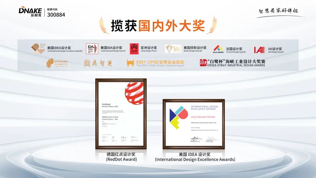 正是这种对产品和服务精益求精的追求,狄耐克智慧家庭中控屏系列,凭借卓越出众的产品外观设计、行业领先的创新技术与极具人性的用户体验,揽获德国红点设计奖、美国IDEA设计奖、美国缪斯设计奖等众多国内外大奖。