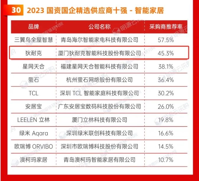 狄耐克智能家居以45.3%的采购商推荐率位列“2023国资国企精选供应商十强”第二名。