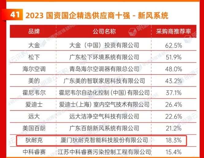 狄耐克新风系统连续多年荣居“2023国资国企精选供应商十强”榜单。