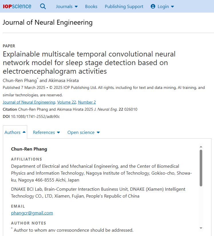 2025年3月,狄耐克脑电波交互事业部的彭俊仁博士在国际期刊《Journal of Neural Engineering(JNE)》发表题为:“Explainable multiscale temporal convolutional neural network model for sleep stage detection based on electroencephalogram activities(基于脑电活动检测睡眠阶段的可解释多尺度时间卷积神经网络模型)”的论文。