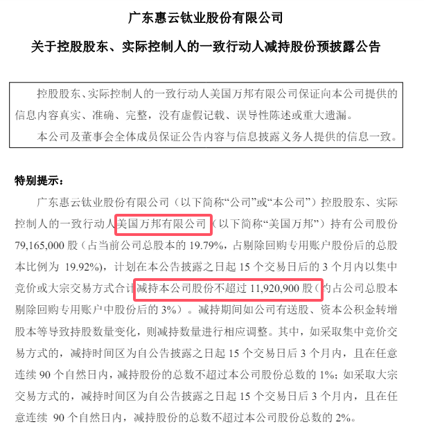 12月23日,惠云钛业披露了一则大股东拟减持公告。宣布其大股东——美国万邦有限公司计划在2025年1月14日至2025年4月13日的时间窗口内,通过大宗交易或竞价交易的方式,减持不超过1192.09万股股份,占公司总股本比例的3%。按照惠云钛业目前8.65元的股份,此次大股东减持将套现1亿元以上。