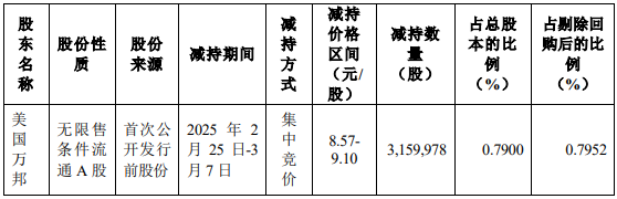 具体减持实施情况来看,2025年2月25日至3月7日,美国万邦通过集中竞价减持3,159,978股,减持价格区间为8.57元/股至9.10元/股,据此计算,减持金额为27,081,011.46元至28,755,799.8元。