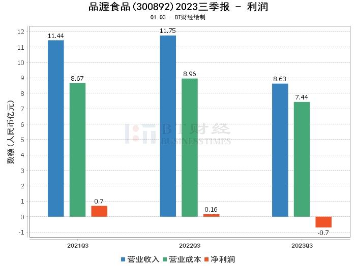 在利润方面,品渥食品2023年三季度的营业收入为8.63亿元,相比上年同期的11.75亿元有所下降。营业利润为-9623.72万元,与上年同期的1844.56万元相比,公司在本期出现了亏损。净利润为-7031.16万元,相比上年同期的1626.33万元,公司在本期也出现了亏损。毛利率为13.79%,相比上年同期的23.74%有所下降。净利率为-8.15%,与上年同期的1.38%相比,公司在本期出现了亏损。