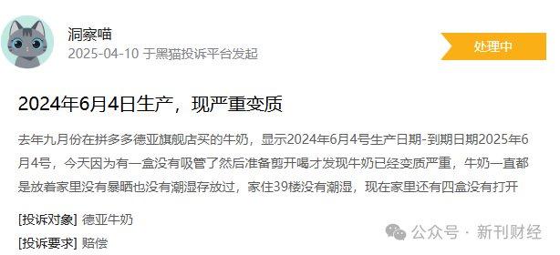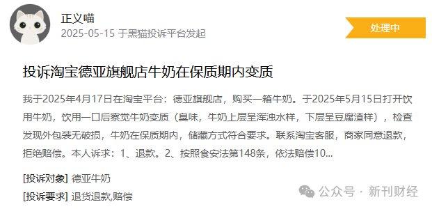 随着消费者认知水平不断提升,对牛奶新鲜度的重视程度与日俱增,对保质期的敏感度也愈发强烈。进口牛奶受限于较长的运输周期,保质期通常为一年,而国内常温液奶的保质期普遍为半年。黑猫投诉[下载黑猫投诉客户端]平台数据显示,截至2025年5月28日,与德亚牛奶相关的投诉约为264件,其中绝大多数都指向了牛奶变质问题。