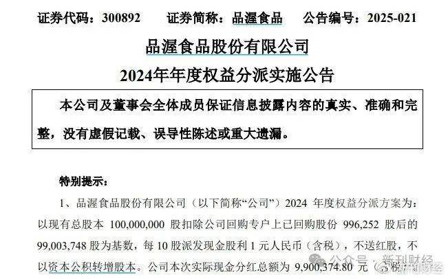 5月28日,品渥食品(300892.SZ)披露了其2024年年度权益分派实施方案。根据公告内容显示,品渥食品计划以剔除回购专户股份后的9900.37万股为基数,向全体股东实施每10股派发现金红利1元(含税)的分配政策,预计合计派发现金红利990.04万元(含税),派息日定于6月5日。