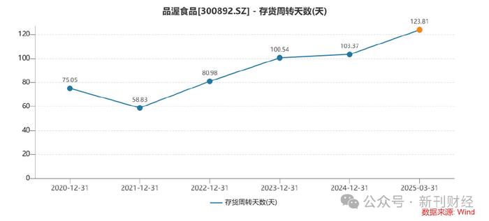 从品渥食品的存货周转天数上也能发现端倪。自2021年底至2025年一季度,品渥食品的存货周转天数持续攀升,已达123.81天,四年多时间内涨幅约110%,产品动销情况日益严峻。