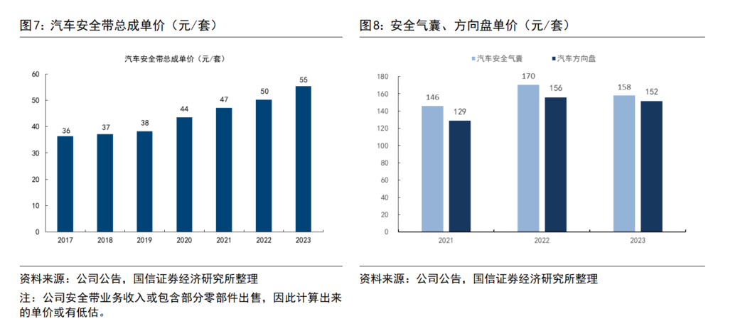 公司汽车安全带总成产品具有紧急锁止、单边和双边预张紧、单边和双边限力、噪声抑制、儿童锁、防反锁等功能。随着汽车安全带总成功能升级演变,公司的产品单价也随之提升,公司2017-2023年安全带单价分别从36元提升至55元,预计随着高性能安全带占比提升,将持续提升公司单车价值量。(注:公司安全带业务收入或包含部分零部件出售,因此计算出来的单价或有低估。)