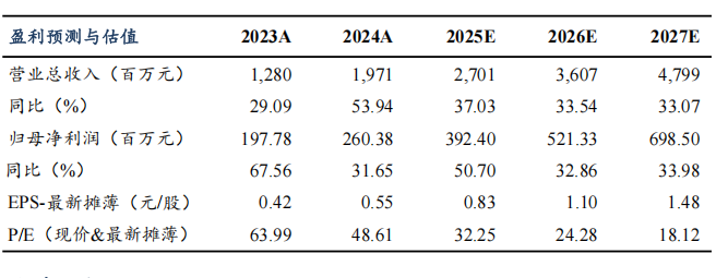 我们维持公司 2025-2027 年归母净利润分别为3.92 亿元、5.21 亿元、6.99 亿元的预测,对应的 EPS 分别为 0.83 元、1.10 元、1.48 元,2025-2027 年市盈率分别为 32.25 倍、24.28 倍、18.12倍,维持“买入”评级。