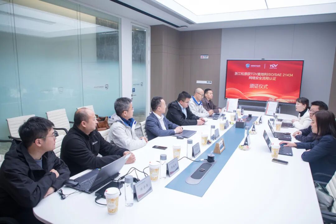 颁证仪式在松原安全总部会议室举行。TüV奥地利集团中国区汽车服务部副总裁徐仕江、销售总监周乐、软件工程与网络安全经理倪志华;公司研发中心高级总监孙波、电子研发部总监何伟、质量中心总监张磊等双方代表共同出席,见证了这一重要时刻。